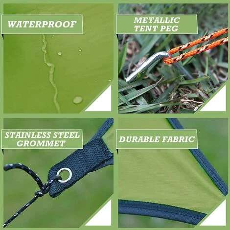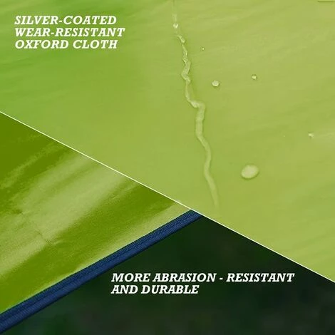 IMPERMÉABLE ET PROTECTION UV: La bâche de camping est fabriquée en tissu Oxford 210D avec revêtement PU imperméable – 2000 mm pour vous garder au sec lorsqu’il pleut et intérieur enduit d’argent pour vous protéger des rayons nocifs du soleil. Convient pour le camping, la randonnée, les événements sportifs, les festivals, les pique-niques et les plages.