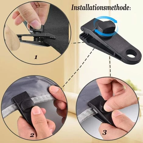 【Facile à installer】Le clip de tente est facile à installer ou à démonter,tourner le bouton pour serrer ou desserrer le clip de tente,qui peut fixer fermement la bâche sans déchirer ou endommager la bâche; l’extrémité du clip est équipée d’un ancrage instantané,qui peut être facilement fixé au grand la plupart des crochets ou cordes standard,sans qu’il soit nécessaire de percer des trous dans le couvercle.