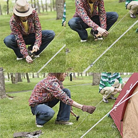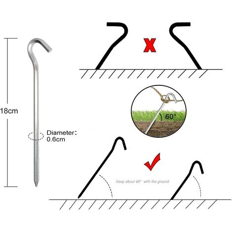 - 『Facile à Utiliser』: Vous prenez le clous de tente d’extérieu et vissez-le dans le sol, ‘angle entre les chevilles et le sol devrait rester d’environ 60 degrés, tapez sur le haut du piquet de tente avec un maillet de camping, les chevilles en aluminium aux extrémités pointues peuvent simplement être enfoncées et non pliées.
