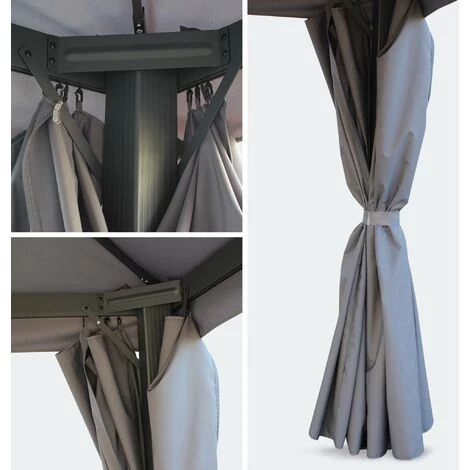 Grâce à ses rideaux et ses fermetures éclair, cette pergola peut se fermer entièrement si besoin.
