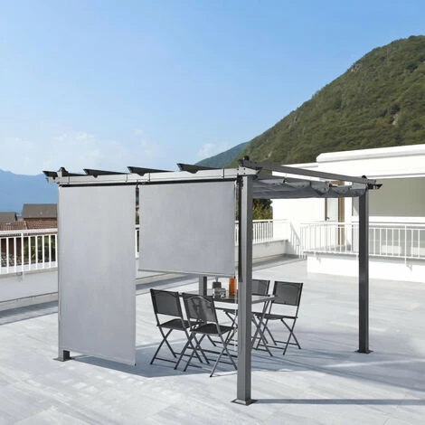Lot de 2 stores enrouleurs gris pour pergola – Dimensions produit: L2.25m x l1.2m – Dimensions crochets: L4 x l2 x H7.5cm – Matériaux: Polyester 180 g / m² – Structure en aluminium et fonte – Ouverture manuelle – Convient aux pergolas d’une dimension de 3x3m Résistant aux intempéries et a l’eau, dure dans le temps et facile a nettoyer