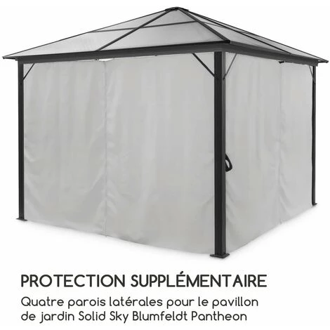L’ensemble d’accessoires Blumfeldt Pantheon Solid Sky Ambient Solar comprend quatre parois latérales qui s’installent chacune sur un poteau latéral en un rien de temps grâce à des boucles coulissantes. Leur matériau en polyester robuste de 140 g / m² est non seulement hydrofuge, mais également opaque et coupe-vent et offre une ombre rafraîchissante les jours ensoleillés. Les fermetures à glissière intégrées permettent de connecter très facilement les parois comme vous le souhaitez.
