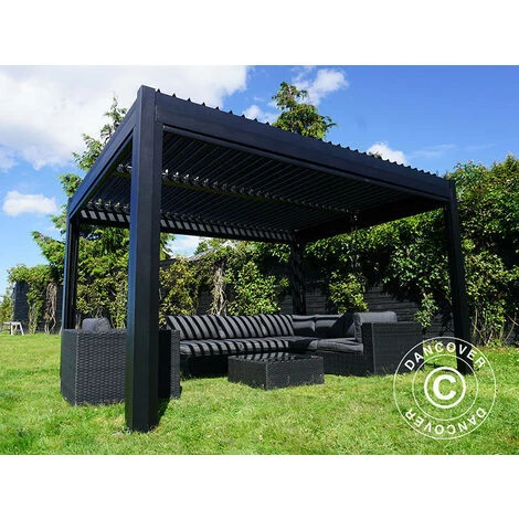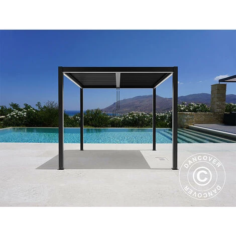 Cette tonnelle ou cette pergola bioclimatique haut de gamme aura un aspect étonnant dans la plupart des endroits — dans votre jardin, sur la terrasse, au bord d’une piscine, etc. L’aspect moderne et élégant s’adaptera partout, et vous pourrez l’utiliser aussi bien pour vous abriter de l’ombre que d’un peu de pluie. Vous pouvez ouvrir ou fermer le toit à lamelles innovant en utilisant les manivelles à l’intérieur de la tonnelle. Ouvrez les lamelles lorsque vous voulez profiter du soleil et refermez-les pour vous mettre à l’ombre ou vous abriter d’un peu de pluie. La tonnelle est étanche et résistante aux UV. C’est une structure unique et élégante, que vous pouvez concevoir vous-même si vous commandez une ou plusieurs parois latérales. Avec une ou plusieurs parois latérales, vous pouvez avoir encore plus d’ombre, vous abriter et fermer un peu la tonnelle pour profiter de la vie à l’extérieur par tous les temps, de jour comme de nuit.