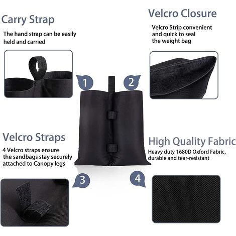【Stable et Robuste】 Les sacs de poids à baldaquin sont équipés de deux ceintures de fixation, ce qui permet de les attacher fermement au cadre de la tente à baldaquin, les fermetures velcro empêchent le sable de se répandre pendant l’utilisation et garantissent que les sacs de poids de sable restent solidement attachés aux pieds de la tente. vous permet d’installer et de retirer les sacs de sable rapidement et facilement