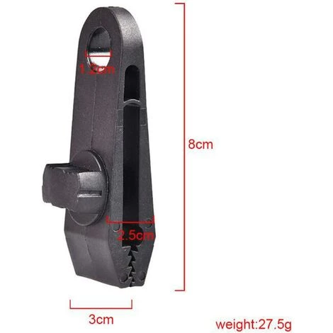 Facile à utiliser : saisissez simplement le bord de la bâche, poussez les mâchoires et serrez. Enfin, vous pouvez fixer les boutons à vis avec un élastique en serrant ou desserrant simplement les boutons. Le clip peut résister à une grande force de tractionet il n’est pas facile de tomber après avoir été suspendu à la tente.