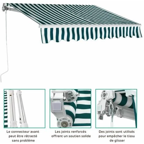 - Êtes-vous à la recherche d’un auvent pour prendre le frais? Notre auvent rétractable sera idéal pour vous! Fabriqué en aluminium robuste et en polyester de haute qualité, notre auvent imperméable et résistant aux UV vous offre l’ombre sous le soleil et l’abri de la pluie. L’apparence classique de cet auvent peut rehausser le goût de votre maison et attirer l’attention de la clientèle. N’hésitez pas à ramener chez vous !