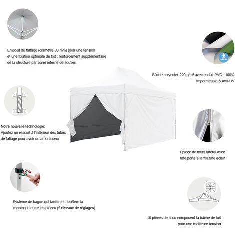 * CONÇU POUR LES PARTICULIERS ET LES PROFESSIONNELS : Tente pliante 3×4,5m, tube de 32 mm en ACIER PREMIUM et tissu en polyester 420D avec une pelliculé argenté, idéale pour les particuliers et les professionnels aussi tout évènements en extérieur et/ou en intérieur. Composé de sa structure, d’une bâche de toit et son pack 4 murs. EXCELLENT RAPPORT QUALITE-PRIX de montage/démontage sans aucun outil avec facilité de transport !