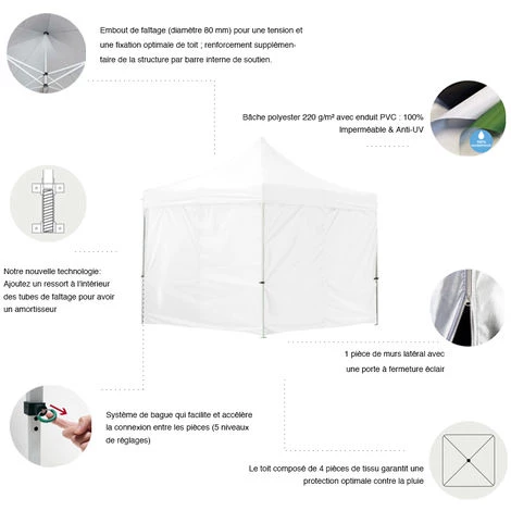 Sa résistance dans le temps et sa facilité de montage/démontage vous apporteront un excellent rapport qualité-prix. Ce modèle de la gamme LIGHT est vendu avec une bâche de toit + 4 bâches latérales en polyester de 220g/m²avec enduit PVC (coutures thermo-soudées), ce qui offre une imperméabilité à 100% et une protection fiable contre la pluie et le soleil.