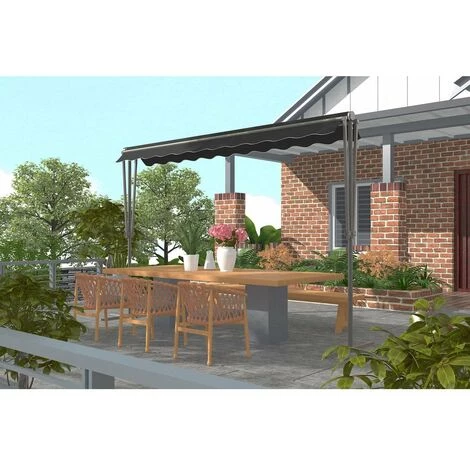 Store banne double pente « Sola » Nous vous proposons ce magnifique store double pente Sola. Il est parfait pour profiter des beaux jours sans être perturbé par le soleil et ainsi s’assurer une bonne protection. Grâce à ses dimensions généreuses, ce store banne sur pied est idéal pour couvrir un salon extérieur ou un grand espace. Il apportera une touche de modernité et d’élégance à votre extérieur. Descriptif : Store banne double pente Sola – Gris foncé. Store banne : Toile : Gris foncé. Structure : Grise. Toile : Polyester avec revêtement en polyuréthane Densité de la toile : 280 g/m². Structure : Acier (pieds), aluminium (armature). Store banne : Dimensions : 295 x 300 x H 300 cm Hauteur de l’auvent : 249 cmLongueur de l’auvent : 275 cm Largeur de l’auvent : 150 cm Profondeur totale : 290 cmLargeur des pieds : 100 cm. Hauteur de la manivelle : 160 cm. Les + produit : Anti-UV (50 +) Anti-rouille (essai au brouillard salin pendant 120 heures) Résistant à l’eau. Poids : 35.33 kg. Colisage : 1 colis : – 3,1 x 0,24 x 0,19 m, 41,75 kg.