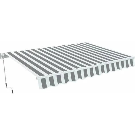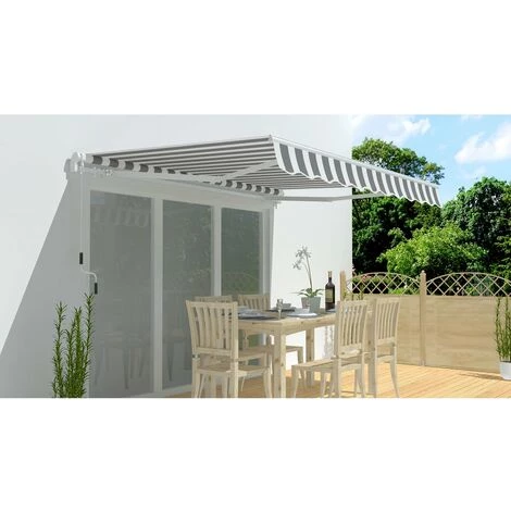 Store Banne « Ombra » – Rayé Gris/blanc – Dimensions : 395 x 250 cm – Structure : aluminium, acier – Toile : polyester avec revêtement en polyuréthane – Densité de la toile : 280 g/m² – Manivelle manuelle – Volant peut s’enlever – Anti-UV (50+) – Anti-rouille – Résistant à l’eauStore banne en aluminium et acier « Ombra 3 »