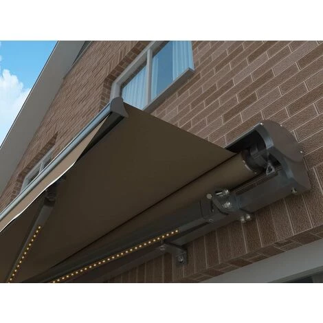 Store banne motorisé « Ombra 4 » Le store banne motorisé Ombra 4 sera parfait pour aménager votre terrasse. Grâce à sa toile en polyester et traité contre les UV, il vous protègera contre le soleil et la pluie. Avec une structure en aluminium, il saura facilement s’intégrer à votre environnement extérieur. Une fois fermé, vous vous retrouvez avec un store banne discret fixé sur la façade de votre maison. Alors n’hésitez plus ! Descriptif : Store banne motorisé Ombra 4 Se fixe contre un mur en béton ou en brique La cantonnière est enlevable Vis d’installation incluses Inclinaison : 5 °. Store banne : Taupe. Structure : Gris. Toile : Polyester avec revêtement en polyuréthane Densité de la toile : 280 g/m². Structure : Aluminium, acier. Store banne : Dimensions totales : 395 x 300 x 20 cm Dimensions quand le store est fermé : 395 x 17 x 20 cm Longueur de l’auvent : 383 cm Largeur de l’auvent : 290 cm Profondeur totale : 19 cm. Tube cylindre : Dia : 78 mm. Barre frontale : 47 x 35 mm. Bras articulés : 66 x 32 mm 58 x 27 mm. Les + produit : Traitement toile : protection UV (50+) Anti-rouille (essai au brouillard salin pendant 120 heures) Résistant à l’eau Avec LED avec télécommande de contrôle Ouverture automatique du store. Données électriques : 230V~ , 50Hz , 1A , 220W , IPX4. Poids : 43 kg. Couleur : Marron. Colisage : 1 colis : – 4,1 x 0,235 x 0,2 m, 48,2 kg.