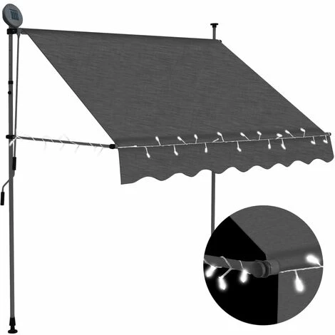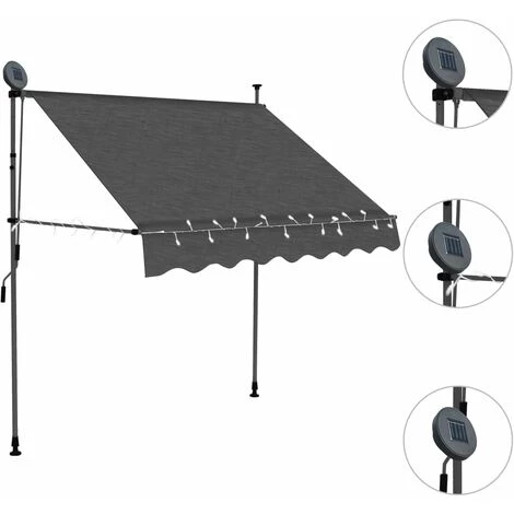 Cet auvent rétractable sera idéal devant la fenêtre, sur la terrasse, le balcon ou dans votre jardin. Cet auvent hydrofuge et anti-salissure et résistant aux UV et aux intempéries est fabriqué en polyester de qualité avec un revêtement PU. Le cadre en acier fort rend l’auvent robuste et durable. L’auvent en polyester facile à nettoyer peut être retiré et lavé. Grâce à la manivelle de la poignée, ce store est rétractable. La hauteur et l’angle du store peuvent également être ajustés. De plus, les lampes LED alimentées par l’énergie solaire permettent d’économiser l’énergie la nuit. L’auvent est facile à assembler. Cet auvent est le choix idéal pour votre espace de vie extérieur et peut être actionné manuellement.