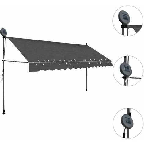Cet auvent rétractable sera idéal devant la fenêtre, sur la terrasse, le balcon ou dans votre jardin. Cet auvent hydrofuge et anti-salissure et résistant aux UV et aux intempéries est fabriqué en polyester de qualité avec un revêtement PU. Le cadre en acier fort rend l’auvent robuste et durable. L’auvent en polyester facile à nettoyer peut être retiré et lavé. Grâce à la manivelle de la poignée, ce store est rétractable. La hauteur et l’angle du store peuvent également être ajustés. De plus, les lampes LED alimentées par l’énergie solaire permettent d’économiser l’énergie la nuit. L’auvent est facile à assembler. Cet auvent est le choix idéal pour votre espace de vie extérieur et peut être actionné manuellement.