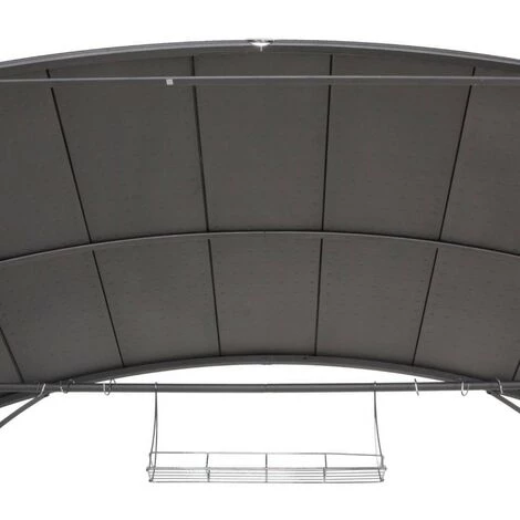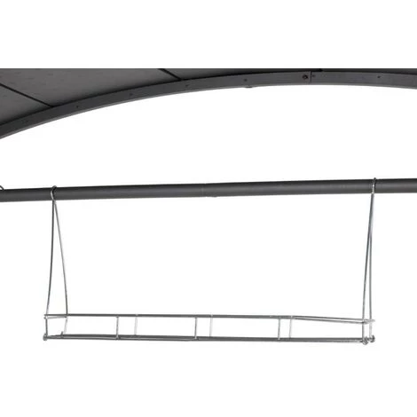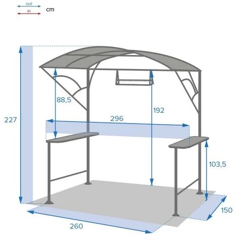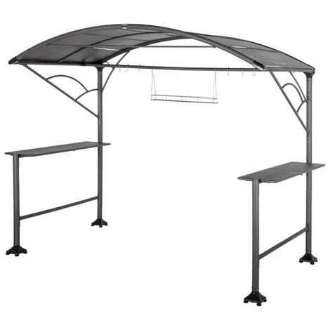 Abri Neiba de la marque Hespéride spécialement conçu pour abriter votre barbecue ou votre plancha sur votre terrasse. Abrite du soleil et de la pluie. Equipé de 2 étagères latérales + panier porte-épices suspendu + crochets pour vos ustensiles. Coloris gris et graphite (noir légèrement moucheté de blanc). En acier traité époxy contre la rouille. A monter soi-même. Dimensions 3×1.5 m, hauteur 2.3 m. Poids 68 kg.