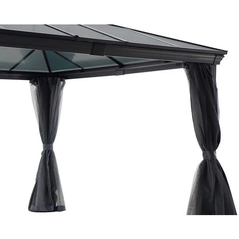La tonnelle de jardin Belize vous mettra à l’abri des rayons du soleil comme des averses fines de l’été.Elle est idéale pour être installée au-dessus d’une table à manger extérieure, d’un salon de jardin et même d’un spa gonflable. Cette grande tonnelle possède un toit résistant transparent en polycarbonate pour une touche moderne dans la jardin.Son avantage ? La tonnelle Belize est équipée d’un jeu de 4 rideaux et de 4 moustiquaires qui vous protégeront le soir venu des moustiques et autres insectes volants.Fabriquée pour durer, cet abri possède une structure en aluminium pour une grande solidité contre les intempéries. Le toit en polycarbonate lui confère une grande résistance aux chocs.