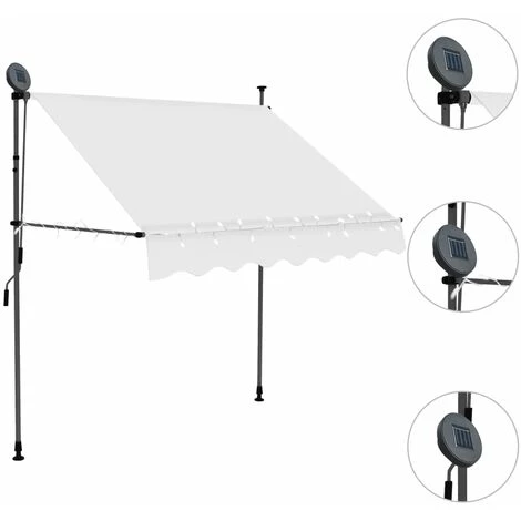 Cet auvent rétractable sera idéal devant la fenêtre, sur la terrasse, le balcon ou dans votre jardin. Cet auvent hydrofuge et anti-salissure et résistant aux UV et aux intempéries est fabriqué en polyester de qualité avec un revêtement PU. Le cadre en acier fort rend l’auvent robuste et durable. L’auvent en polyester facile à nettoyer peut être retiré et lavé. Grâce à la manivelle de la poignée, ce store est rétractable. La hauteur et l’angle du store peuvent également être ajustés. De plus, les lampes LED alimentées par l’énergie solaire permettent d’économiser l’énergie la nuit. L’auvent est facile à assembler. Cet auvent est le choix idéal pour votre espace de vie extérieur et peut être actionné manuellement.