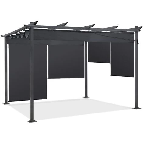 Passez d’agréables moments dans votre jardin grâce à cette pergola gris anthracite dotée d’un toit rétractable. Elle vous protège du soleil afin que vous profitiez des belles journées ensoleillées. La pergola gris anthracite toit rétractable s’adapte à vos besoins : créez un espace ombragé en tendant la toile ou au contraire, laissez passer les rayons du soleil en ouvrant la toile pour profiter d’un grand ensoleillement. Grâce à cette édition spéciale, vous pourrez également profiter de stores enrouleurs inclus ! Ajustez les stores latéraux selon vos envies et disposez d’un ombrage supplémentaire, idéal pour un repas à l’abri du soleil. Chaque pergola dispose de 2 stores de 120 x 225 CM et de 2 stores de 170 x 225 CM. Pour un ombrage optimal, nous vous conseillons d’installer 2 stores de 120 cm sur la largeur de la pergola (3M) et 2 stores de 170 CM sur la longueur de la pergola (4M). Vous pouvez cependant disposer les stores comme vous le souhaitez. Grâce à une structure en métal gris foncé, cette pergola de 2.96 x 3.96 M vous assure stabilité et longévité. Robuste, la pergola se fixe au sol avec ses pieds de 60 x 60 MM. Conçue avec des matériaux de qualité, la pergola édition spéciale est équipée d’une toile 100% polyester 180 gr/m² pour le toit ainsi que de 4 stores enrouleurs 100% polyester 180 gr/m². N’attendez plus pour passer de joyeux moments en famille ou entre amis tout en profitant du soleil selon vos envies ! Dimensions de la pergola 3×4 M et 4 stores enrouleurs- Dimensions totales : Longueur 396 x largeur 296 x Hauteur 230 CM- Dimensions des pieds : 60 x 60 MM- Structure en métal- 5 poutres supérieures- Toile (toit) 100 % polyester 180 gr/m²- 2 stores enrouleurs gris anthracite : largeur 120 x Hauteur 225 CM- 2 stores enrouleurs gris anthracite : largeur 170 x Hauteur 225 CMNous vous conseillons en cas d’intempéries (pluie et vent) de retirer la toile de sa structure afin de prévenir le risque de stagnation d’eau. Nous vous recommandons également d’enlever les stores enrouleurs de la structure de la pergola en cas de forts vents.Veillez également à bien fixer la pergola au sol afin d’assurer une bonne stabilité.Retrouvez l’ensemble de notre gamme de pergolas sur notre boutique en ligne ! – HORS CORSE -article non livrable en Corse
