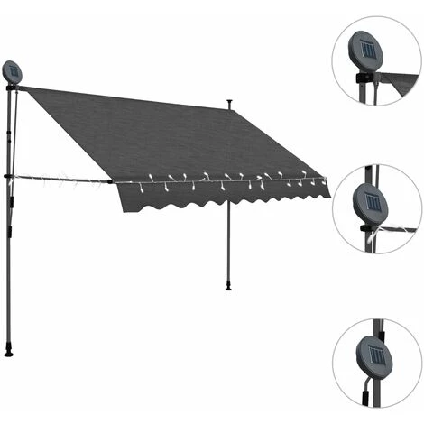 Cet auvent rétractable sera idéal devant la fenêtre, sur la terrasse, le balcon ou dans votre jardin. Cet auvent hydrofuge et anti-salissure et résistant aux UV et aux intempéries est fabriqué en polyester de qualité avec un revêtement PU. Le cadre en acier fort rend l’auvent robuste et durable. L’auvent en polyester facile à nettoyer peut être retiré et lavé. Grâce à la manivelle de la poignée, ce store est rétractable. La hauteur et l’angle du store peuvent également être ajustés. De plus, les lampes LED alimentées par l’énergie solaire permettent d’économiser l’énergie la nuit. L’auvent est facile à assembler. Cet auvent est le choix idéal pour votre espace de vie extérieur et peut être actionné manuellement.