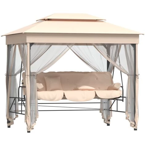 Ce belvédère à balancelle élégant et spacieux peut accueillir confortablement deux personnes et offre de l’ombre pour vous abriter du soleil grâce à son grand auvent. Grâce aux rideaux équipés de fermetures à boucles et crochets, vous pouvez facilement fermer les quatre côtés pour créer une zone fermée. Le filet fermé est idéal pour empêcher les insectes volants d’y entrer et vous offrir un refuge privé. Le siège peut être converti en un lit. Deux oreillers rectangulaires et deux oreillers cylindriques sont inclus pour plus de confort. Le cadre en acier durable a reçu une finition enduite de poudre résistante à la corrosion. Les housses de coussin en polyester imperméables sont amovibles pour un nettoyage facile. L’assemblage est également très facile.