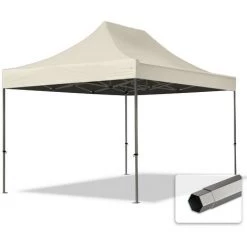 Tonnelle pliante avec armature en acier robuste – parfaite pour une utilisation professionnelle. Cette tonnelle pliante a été conçue pour satisfaire les plus hautes exigences, et allie fonctionnalité et robustesse. L’armature solide, en acier complètement galvanisé, est protégée contre la corrosion grâce à un traitement de surface selon la norme DIN 55633, et est constituée de pieds de tente en profilés carrés de dimensions 40×40 mm, de 1,2 mm d’épaisseur. La tonnelle pliante est ainsi sûre et très stable. Les éléments d’articulation sont assemblés avec des matériaux en polymère incassable et toute la structure en acier est vissée, si bien que toutes les pièces peuvent être remplacées. Grâce au mécanisme en ciseaux facile à déployer et au système pratique de fixation par clips, la tonnelle pliante peut être montée et démontée sans aucun outil. Le matériau utilisé pour la toile est du polyester de haute qualité, épais de 350 g/m² et recouvert d’une couche de PVC. Toutes les coutures sont thermo-soudées. La bâche est 100% imperméable et protège des rayons UV (indice 80+). La tonnelle pliante dispose de 5 hauteurs réglables et est livrée avec une housse de transport sur roulettes très pratique.