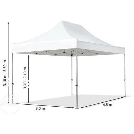 La tente pliante 3×4,5m PROFESSIONAL de couleur bleu sans toiles latérales se monte très rapidement et est très facilement transportable grâce à la housse de transport incluse à la livraison. La hauteur de côté de la tente pliante est modifiable selon vos envies entre env. 1,90 – 2,30 m. L’armature en Aluminium est stable et robuste. Le mécanisme en ciseau de la structure vous permet de monter et démonter la tente en quelques minutes seulement. La toile de tente d’env. 400 g/m² épaisse de Polyester haute qualité est résistante et offre protection contre la pluie et le soleil. La tente pliante peut être utilisée par exemple comme sas d’entrée, pavillon de jardin, point de vente ou espace d’accueil et sera très pratique pour les salons, marchés et tous vos évênements. Dans sa position fermée, notez que la tente pliante occupe très peu de place. Enfin, vous recevrez à la livraison des câbles et des systèmes d’ancrages pour sol meuble.