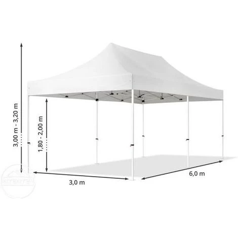 La tente pliante 3x6m ECONOMY de couleur blanc (2 toiles latérales incluses) se monte rapidement et se transporte facilement Grâce aux housses de transport inclues dans la livraison. Il est possible de régler la hauteur de côté entre env. 2,00 – 2,20 m (3 réglages possibles). L’armature en Acier est stable et solide. Grâce au mécanisme en ciseau, la tente pliante peut être montée et démontée en un tour de main et sans aucun outil. La toile en Polyester haute qualité d’env. 300 g/m² d’épaisseur est robuste et offre un abri contre le soleil et les averses. La tente pliante peut par exemple servir d’entrée abritée, de pavillon de jardin ou de point de vente. Elle est particulièrement adaptée pour vos salons, fêtes ou expositions. Rangée dans sa housse de transport, la tente pliante est très peu encombrante. Des piquets pour sol meuble et des attaches assurent l’ancrage au sol.