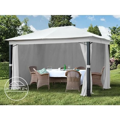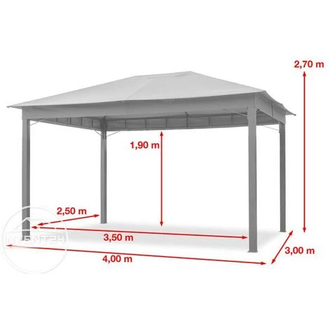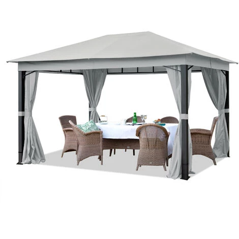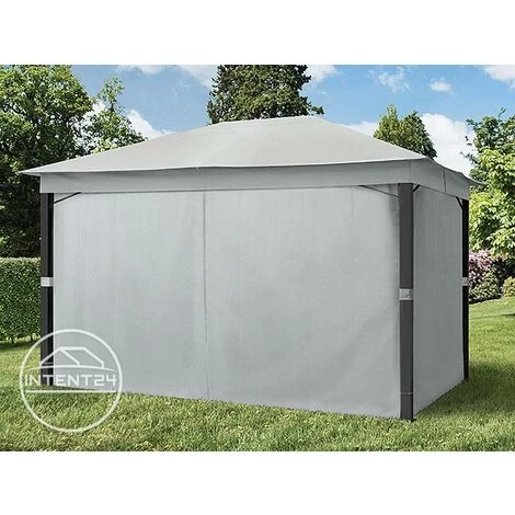 Ce pavillon de jardin se montre très élégant. Les poteaux en aluminium avec leurs profilés d’environ 9×9 cm constituent la base d’une bonne stabilité. Le cadre en aluminium résistant aux UV, à la corrosion et aux intempéries vous donne une construction robuste. De plus, la construction du pavillon au moyen du système à clips de haute qualité est rapide et facile à monter. La bâche en polyester de 220 g / m² avec revêtement PU et protection UV 50+ sert non seulement de parasol, mais est également 100% imperméable. Les 4 panneaux latéraux fournis et assortis aux couleurs garantissent l’intimité de chacun.