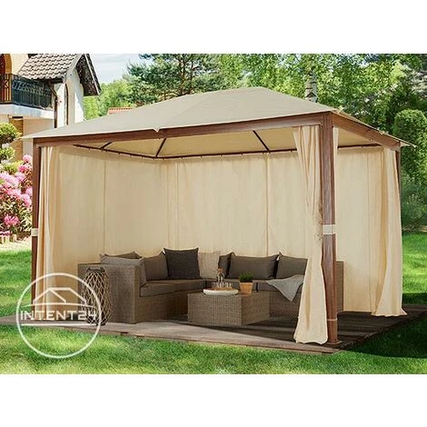A distance, la tonnelle semble être en bois véritable, son apparence en confondra plus d’un ! Les pieds de la tonnelle sont en aluminium thermolaqué et son toit en polyester de 220 g/m² environ. La tonnelle de jardin est donc 100% imperméable et résiste très bien aux rayons UV. Celle-ci offre surtout une extrême robustesse et stabilité. A cela s’ajoutent d’élégants rideaux, créant une atmosphère conviviale tout autour de la tonnelle.