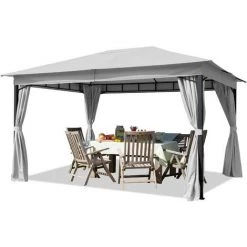 Ce pavillon de jardin associe design moderne et intemporel à la fois de stabilité et de robustesse. La construction massive en acier avec des poteaux d’environ 6x6cm assure une stabilité solide et fiable. De plus, le revêtement en poudre cuite des éléments en acier assure une protection contre les intempéries. De plus, la construction du pavillon est simple et rapide grâce au système de clic clic-bouchon de haute qualité : la bâche en polyester de env. 180g/m² avec protection UV de 30+ sert non seulement de diffuseur d’ombrage, mais est également 100% imperméable grâce au revêtement en PU l’intimité individuelle est assurée par les 4 panneaux latéraux fournis et de couleur assortie.