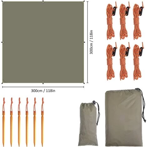 Multifonctionnel. La taille de bâche anti-pluie est de 3 × 3 m, la bâche peut être largement utilisée comme toile de tente, pare-soleil ou pare-pluie, rain tarp pour hamac, rain tarp de cuisine extérieure, tente simple, abri temporaire, couverture de pique-nique, tapis de sol, etc. .