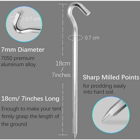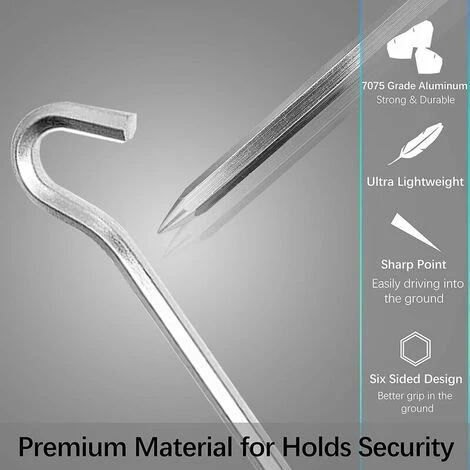 Stable et léger: Ces piquets de tente en aluminium à haute résistance et antirouille peuvent résister même à un coup de marteau. Dans les sols durs, les chevilles en aluminium aux extrémités pointues peuvent simplement être enfoncées et non pliées. De plus, les piquets de tente en aluminium sont plus légers que les piquets de tente en acier, ils sont donc idéaux pour les randonnées.