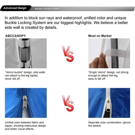 Installation facile, ferme et fiable : S’adapte en toute sécurité à votre auvent avec des sangles Velcro sur le dessus pour l’attacher aux traverses de l’auvent, 8 languettes Velcro à attacher autour des pieds du cadre pour une utilisation sur un seul mur. Avec connecteurs zippés pour relier les parois latérales les unes avec les autres lors de plusieurs utilisations.