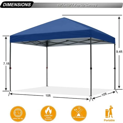 Large zone d’ombrage : 2 x 2 toit instantané offre plus d’ombre. 4 mètres carrés d’ombre pour 4 6 personnes, plus grand que la plupart des auvents. Assez pratique pour les marchés aux puces, les fêtes, la plage, les affaires, les événements sportifs, les activités de communauté et tous les événements en plein air.