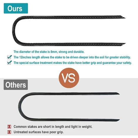 ➤Piquets de conception en forme de U avec extrémités inclinées pour une insertion facile dans le sol, aidant à stabiliser le trampoline pendant les tempêtes ou les vents forts.