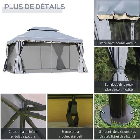 Cette magnifique tonnelle style colonial pourrait vous offrir de l’ombre ou vous le souhaitez ! C’est est un barnum de jardin design et pratique idéal pour toute la famille ! Equipé d’un toit double, de 4 moustiquaires et 4 rideaux, vous et vos invités seront parfaitement protégés contre le soleil et contre les insectes tout en profitant d’un air respirable et agréable. En plus, l’installation de cette tonnelle de 12 m² de surface sol environ est facile et rapide. Laissez-vous tenter !