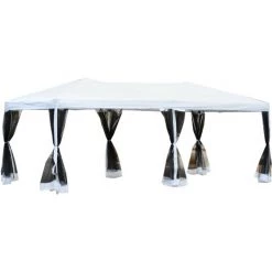 Description : Cette superbe tonnelle de jardin pop-up avec moustiquaires amovibles vous permettra de profiter pleinement des beaux-jours ! Très facile à installer grâce à son système d’ouverture fermeture pop-up, vous pourrez en profiter très rapidement pour toutes occasions : mariage, baptême, anniversaire, fêtes diverses. Caractéristiques : – Tonnelle barnum de style colonial très élégant – Tonnelle pliante système pop-up : installation et démontage pratique et rapide – Idéal pour organiser une fête type mariage, baptême, anniversaire, etc… – Protège efficacement contre le soleil ou la pluie fine – Toile en polyester Oxford haute densité 210D résistante avec système d’attache velcro – 6 moustiquaires amovibles avec zip pour une parfaite protection contre les moustiques et autres insectes nuisibles – Armature robuste en métal époxy anticorrosion pour un usage pérenne – 10 piquets d’ancrage au sol, 6 cordages de serrage et sac de transport inclus Spécifications : – Couleurs principales : blanc et noir – Matériaux principaux : métal époxy anticorrosion, polyester Oxford, gaze (moustiquaire) – Dimensions totales : 5,91L x 2,97l x 2,55H m – Hauteur avant-toit : 2 m – Accessoires fournis : 10 piquets d’ancrage au sol, 6 cordages de serrage et sac de transport inclus – Réf. : 840-012CW