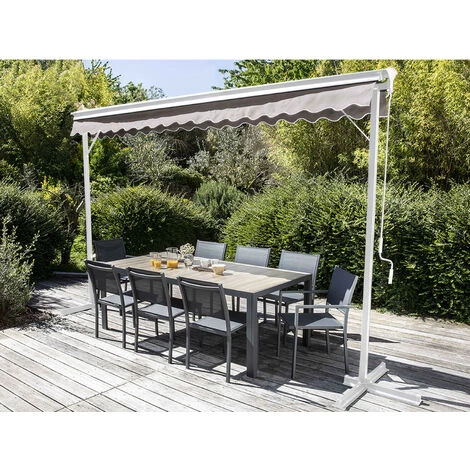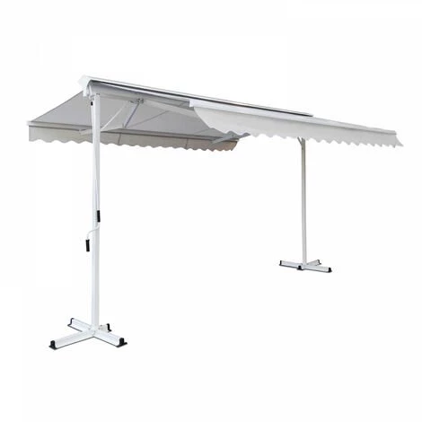 Ce store double pente sur pied manuel avec coffre 3x4m Longueur 4 m x largeur 3 m. Hauteur 2,50 m procure une large surface d’ombrage de 12m². Sa toile 100% polyester 280g/m² enduction polyuréthane déperlante et anti UV s’enroule et se déroule à l’aide d’une manivelle. La structure en aluminium du store extérieur est traitée anti corrosion avec finition peinture époxy anti rouille pour une grande durabilité. Très solide de par ses pieds en aluminium de section 70 mm et de 1,2mm d’épaisseur, sa toile se rétracte dans le coffre pour un store double pente qui se conserve en très bon état dans le temps. Les croisillons des pieds sont fournis, vous pourrez les lester grâce à des dalles de parasol standards. Profitez de repas ensoleillés dans votre jardin ou sur votre terrasse à l’abri des rayons nocifs du soleil grâce au store double pente avec coffre.