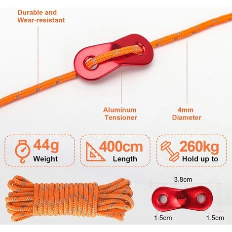 [4 cordons de tente réfléchissants] : La corde réfléchissante possède 2 lignes réfléchissantes entrelacées pour une meilleure visibilité. Le noyau interne est fait de nylon de haute qualité et peut supporter des charges allant jusqu’à 573 lb (260 kg). 4 m (13 pi) de long et ne pèse que 44 g (0,1 lb). Léger mais durable
