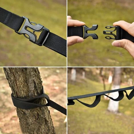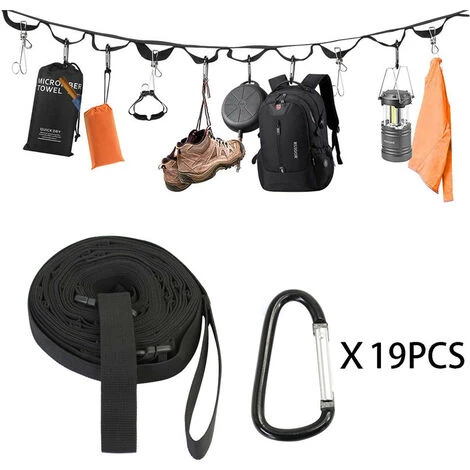 Plusieurs boucles and crochets and pinces à linge : la ceinture principale a 19 boucles. Vous pouvez fixer l’extrémité sur 2 arbres puis installer votre équipement sur la corde. La boucle sur la corde empêche vos objets de glisser au milieu. Vous pouvez ainsi accrocher des équipements de camping spacieux.