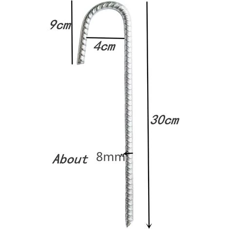 Dimensions : 30 x 9 x 4 cm (H x L x l), environ 9,5 cm de diamètre ; avec une poignée à friction pratique, ces pinces sont extrêmement résistantes et conçues pour contenir les choses les plus grandes et les plus lourdes. Bien mieux que les piquets non nervurés ; l’arche large offre une plus grande plage d’ancrage, conçu pour accueillir également des barres de sol de diamètre allant jusqu’à 40 mm.
