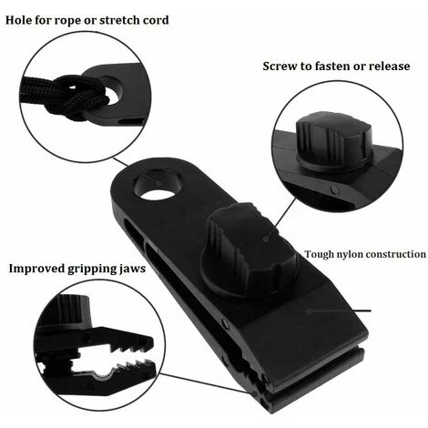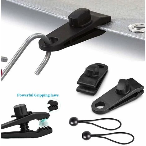 Clip pour bâches : La conception puissante des mâchoires de préhension rend plus stable. L’extrémité arrière du clip de bâche peut être attachée à n’importe quel cordon élastique standard, corde ou cordon extensible pour couper. Largement utilisé: Pince clip bâche sont idéales pour les tentes de camping en plein air, auvents, caravanes, parasol, bâches, auvents, couvertures de bateau, couvertures