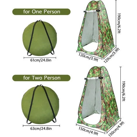 Convient pour la position debout: 6,2 pieds * 3,9 pieds * 3,9 pieds (190 cm * 120 cm * 120 cm) tente 1 personne et 6,2 pieds * 4,9 pieds * 4,9 pieds (190 cm * 150 cm * 150 cm) tente 2 personnes offrent suffisamment d’espace pour montrer ou changer de vêtements.
