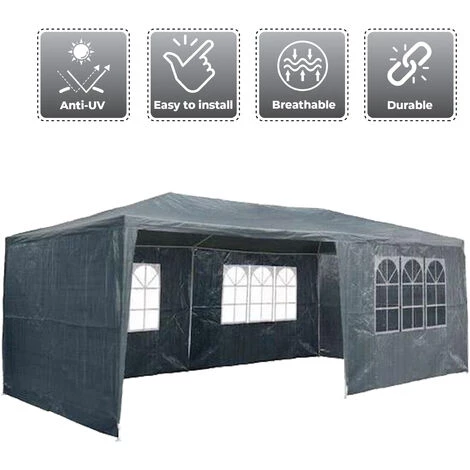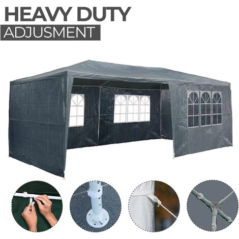 - TOUT EN UN – Vous recevez la structure en tubes dacier ainsi que les raccords correspondants avec la bâche de toit & les 6 parois latérales enroulables. En outre, les 6 pieds, 12 piquets et 6 cordes de tension sont inclus.
