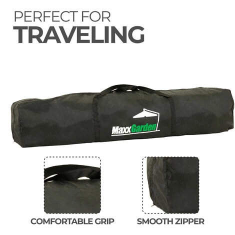 Cette tente de jardin MaxxGarden a des dimensions de 3×4 m et une hauteur de 2,50 m. La hauteur de passage est de 2 m. La tente est facile à installer en quelques minutes. Elle offre une protection contre le soleil, le vent léger et la pluie. Le cadre est en métal et le tissu en polyéthylène imperméable (110 gr / m²). Les tubes métalliques ont une épaisseur de 25x19x0,6 mm.