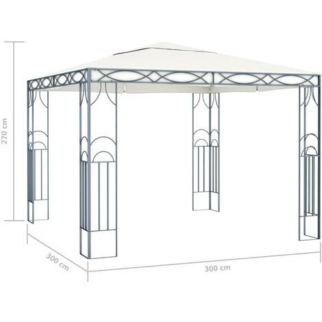 Cette tonnelle présente un design classique et élégant qui conviendra parfaitement comme abri contre le parasol pour les événements en plein air, tels que les dîners, les barbecues, les réunions de famille et d’autres activités. Le toit, composé de 100 % polyester avec peinture PA, vous protège des rayons UV nocifs. La tonnelle est solidement construite en acier résistant et est par conséquent résistante à la rouille et très stable. Des attaches à boucles et à crochets sont également incluses pour faciliter la fixation. La tonnelle peut être facilement fixée au sol avec les accessoires de fixation inclus. Elle est facile à assembler. REMARQUE : ce produit ne doit JAMAIS être utilisé par mauvais temps, tel que vent fort, pluie abondante, neige, tempête, etc.