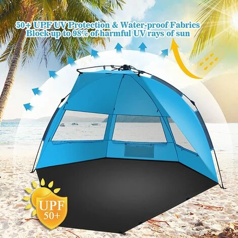 - EASY UP & DOWN: cet abri solaire portable pour la plage peut être incroyablement facile à installer et à démonter en une minute seul. Cette tente à baldaquin facile à monter ne convient ni à la pluie ni à l’eau, mais juste pour vous fournir, à vous et aux enfants, une protection UPF 50+ contre les ombres toute la journée sur la plage.
