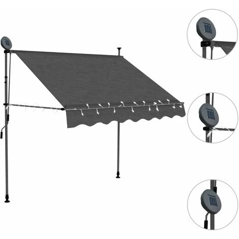 Cet auvent rétractable sera idéal devant la fenêtre, sur la terrasse, le balcon ou dans votre jardin. Cet auvent hydrofuge et anti-salissure et résistant aux UV et aux intempéries est fabriqué en polyester de qualité avec un revêtement PU. Le cadre en acier fort rend l’auvent robuste et durable. L’auvent en polyester facile à nettoyer peut être retiré et lavé. Grace à la manivelle de la poignée, ce store est rétractable. La hauteur et l’angle du store peuvent également être ajustés. De plus, les lampes LED alimentées par l’énergie solaire permettent d’économiser l’énergie la nuit. L’auvent est facile à assembler. Cet auvent est le choix idéal pour votre espace de vie extérieur et peut être actionné manuellement.